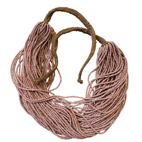These beautiful mauve and pink European made glass beads were traded in West Africa and  native strung and finished in a herringbone braid rope.  It’s a beautiful art piece.