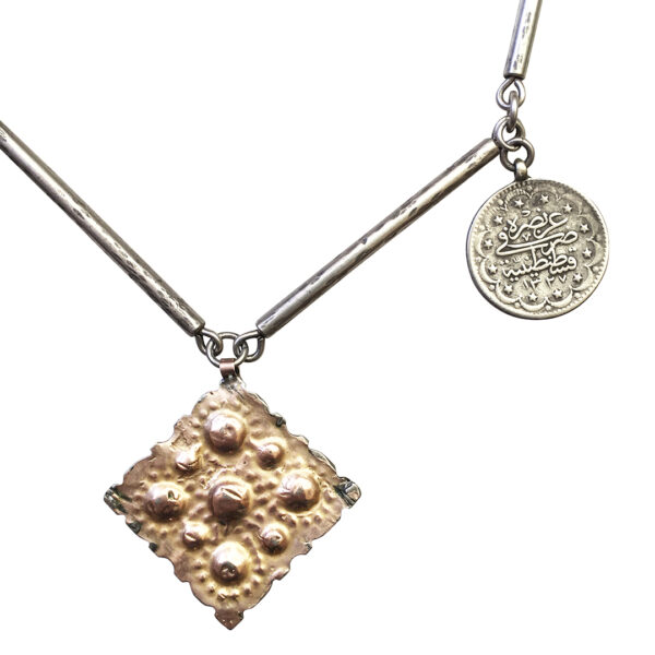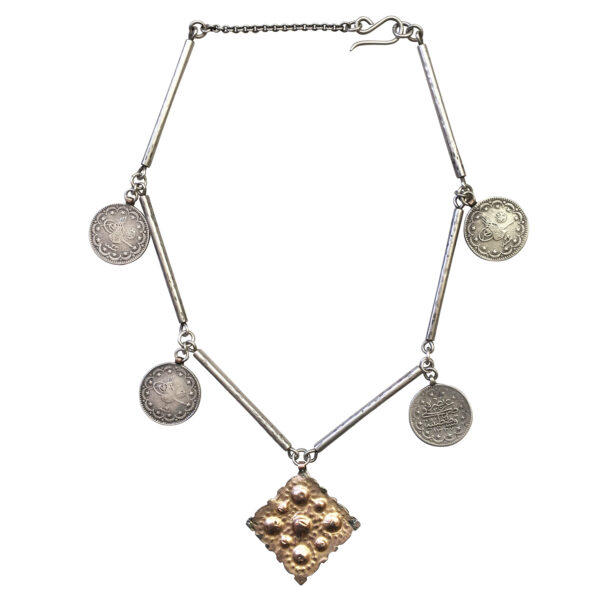 19th – early 20th century Berber gold foil over metal headdress charm and Ottoman silver coins on our sterling handmade chain. It’s chic and simple with a LBT or just a T. Layer it with shells or beads.