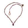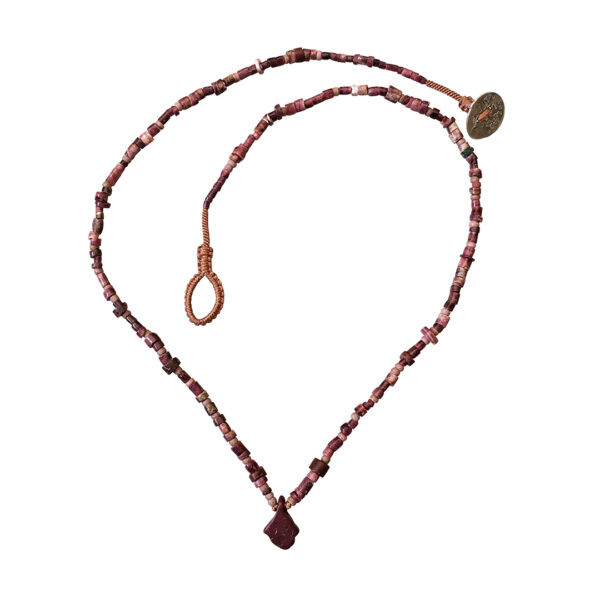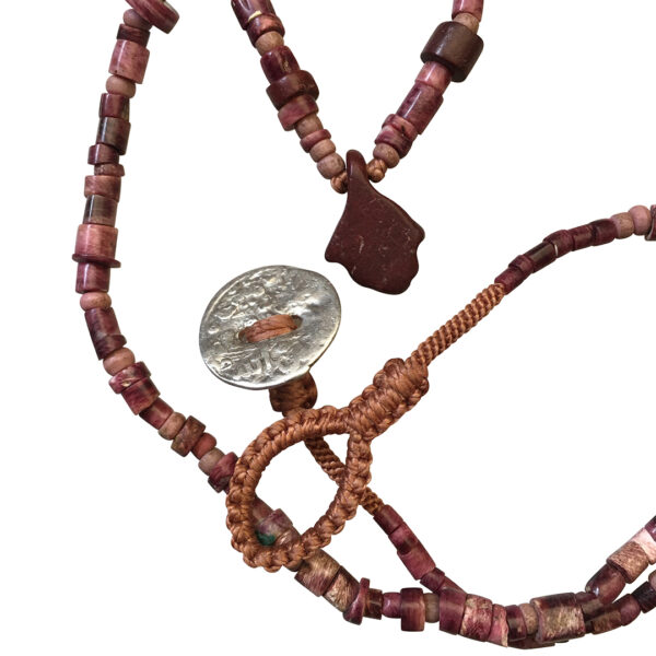The color of these beads range from light red/pink to dark brick .  Spondylus, or spiny oyster, has been used in body adornment since ancient times both in Europe and the Americas.  These beads are from the northern part of Colombia, possibly the Tairona culture.   There are a few 19th century glass trade beads tangled in and we finished the piece with our hand woven cord and coin closure.  It is simple and light and would be great layered with a chain necklace