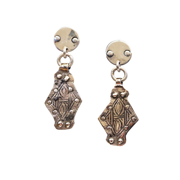 The sweetest little etched silver charms. These are found on headdresses and mixed in with other pieces of jewelry for sparkle. True to form of the Berber, we embellished them with riveted sterling. The post tops are our hand wrought sterling work too.
