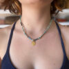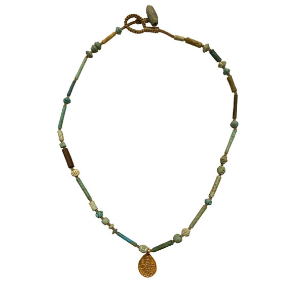 Jewels is currently working on a collection of very diminutive pieces: works with petit beads and charms on our very finest woven cord. This necklace is one of her latest, each bead so delicate, unique and gorgeous. The central piece is a very sweet gold Moroccan charm, elevating the design to elegance. The closure is an ancient blue glass bead.