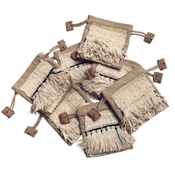 These lovely and ever so useful pouches are hand made by Bouchra in our Marrakech studio. Each are French linen with fragments of old haniras (blankets worn around the shoulders). Use them for travel, to bring your Jewels.