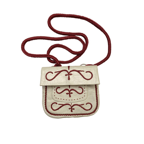 These purses, with the beautiful rope strap and embroidery, are very traditional artisan leather work in Marrakech. It is becoming a dying tradition as there are now only a couple of people making them where once Jewels knew many. The leather is a blue/grey color and wine stitching