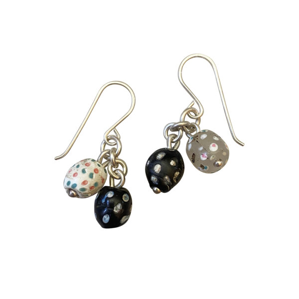 18th & 19th century European made glass beads of perfect polkadots and chic black/white. We made the sterling hooks and links.