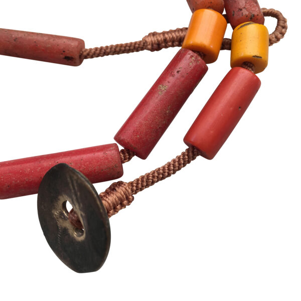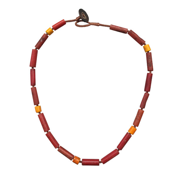 Coral in just about every continent is valued both  for its beauty and as a currency.  The glass version, trade beads, are also collected and valued like coral but at times are more affordable- and just as beautiful.  Jewels designed this strand to reflect the pure quality and bohemian aesthetic of the material.  The colors of these beads are exactly that of varying corals.  They are wonderfully worn with the kind of patina we love.  We wove the cord between each bead giving it a bit of refinement as well as to protect these lovely beads.