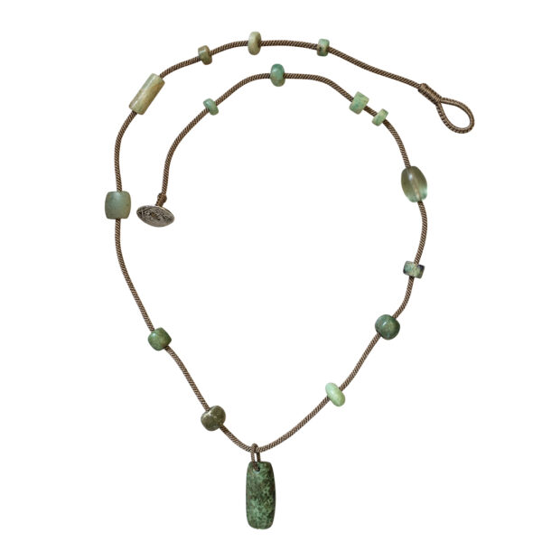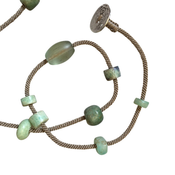 Mainly Pre Columbian greenstone/jade and 19th century amazonite beads. There is also one magic glass bead- for good measure. All this matters, as well as our gorgeous hand woven cord.