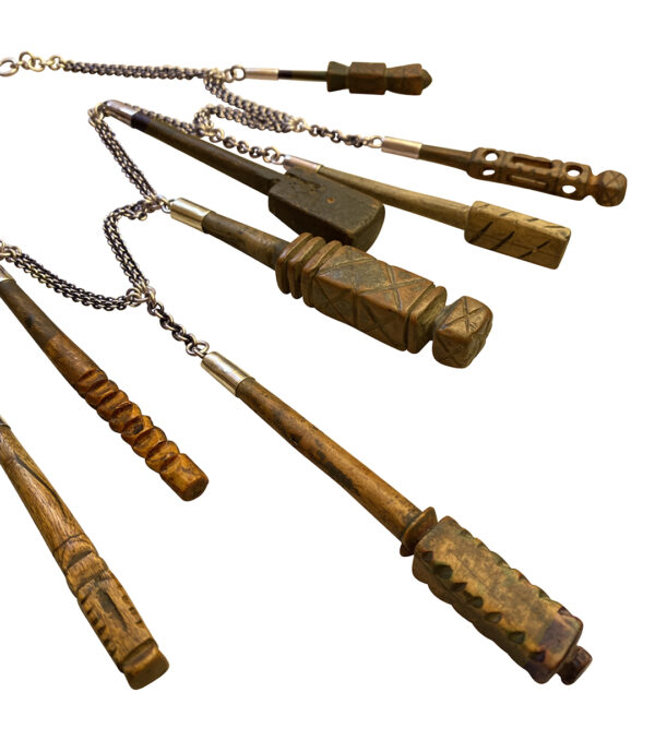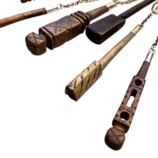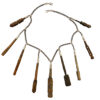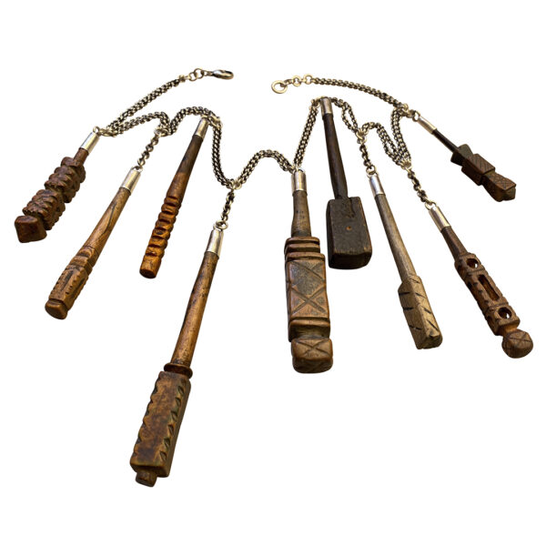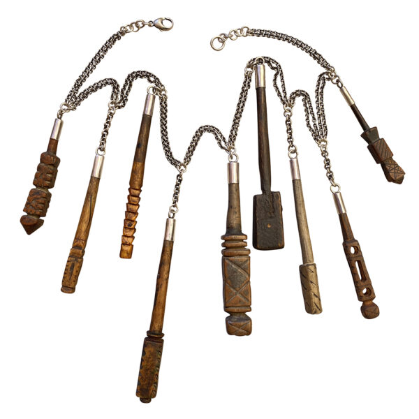 These little sculptures are kohl applicators. Yes, applicators for that black eyeliner seen on the ancient Egyptian paintings and sculptures and those already gorgeous dark eyes of the Amazigh (and other Middle Eastern women). This necklace is a new take on one Jewels designed a few years ago with leather. She had our silversmith cap each in sterling sheet and link them to a double pieced sterling chain. It’s a work of art. For the moment there is only one, though when Jewels can find enough of these little gems she’ll make another. Since she started to collect the applicators a buzz has developed in the markets: the copycats and runners are now on the hunt.
