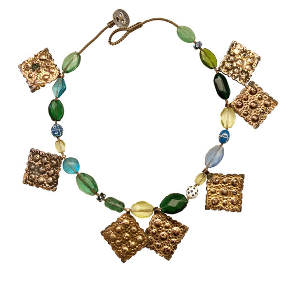 Some of the most gorgeous and unusual French made glass faceted beads traded in Morocco mixed with a fewother glass trade beads, most likely from Venice, all coveted and collected. The square headdress charms are classic Berber (Amazigh) from Tata, a town in Central Morocco, once upon a time known for its jewelry. They are gold foil over metal. All the beads and charms have the worn, wear and patina Jewels seeks. We wove our very finest cord for this necklace.