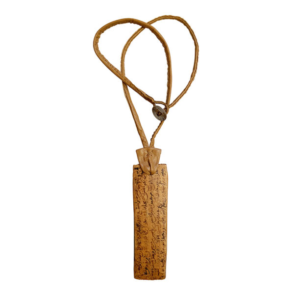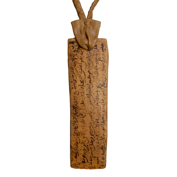 Yes, a land contract. Jewels has collected these wonderful artifacts for years. They are becoming a lost art, though never intended as art. It is often the case objects of utility and importance, once upon a time, had innate beauty. Maybe it had to do with the intention. This piece is wood, the agreement written with a beautiful henna colored ink. As an art collector Jewels finds beauty in many objects of utility and as a jewelry designer almost any object of beauty is fitting for adornment: the eye of a true nomad. Khadija in our Marrakech studio superbly stitched the supple leather.