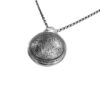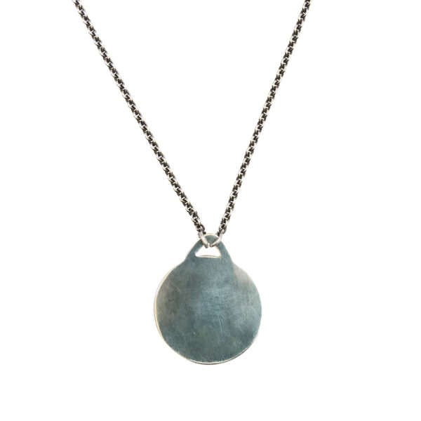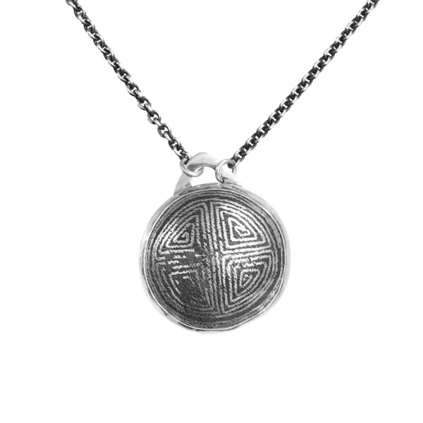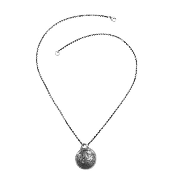 This traditional saddle ornament is made using a difficult technique of silver etched into iron. The Tibetans are known for their sharp skills doing this work. We encased this fabulous piece in sterling.