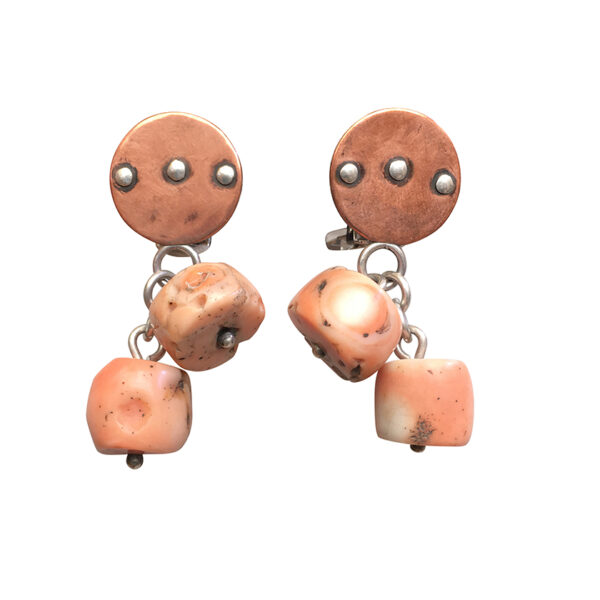 Some of us who don’t wear much color make exceptions for pink, especially this gorgeous salmon colored coral. We made the sterling and copper findings. The tops are clips but you can request post or French hook tops at check out.
