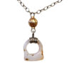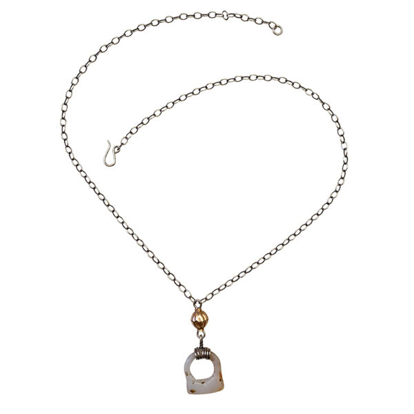 This gorgeous agate hair charm is a more unusual shape, like an ancient ring. It has beautiful wear and patina and is a perfect heirloom piece. The gold bead is from Rissani, Southern Morocco. Jewels has only one person that takes the midnight bus to this remote region to find these little gems. It’s a dying art: the gold work, the journey, the lifestyle. Jewels designed the necklace to wrap the charm and bead with sterling wire, an embelisment in keeping with the old world.