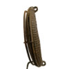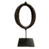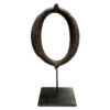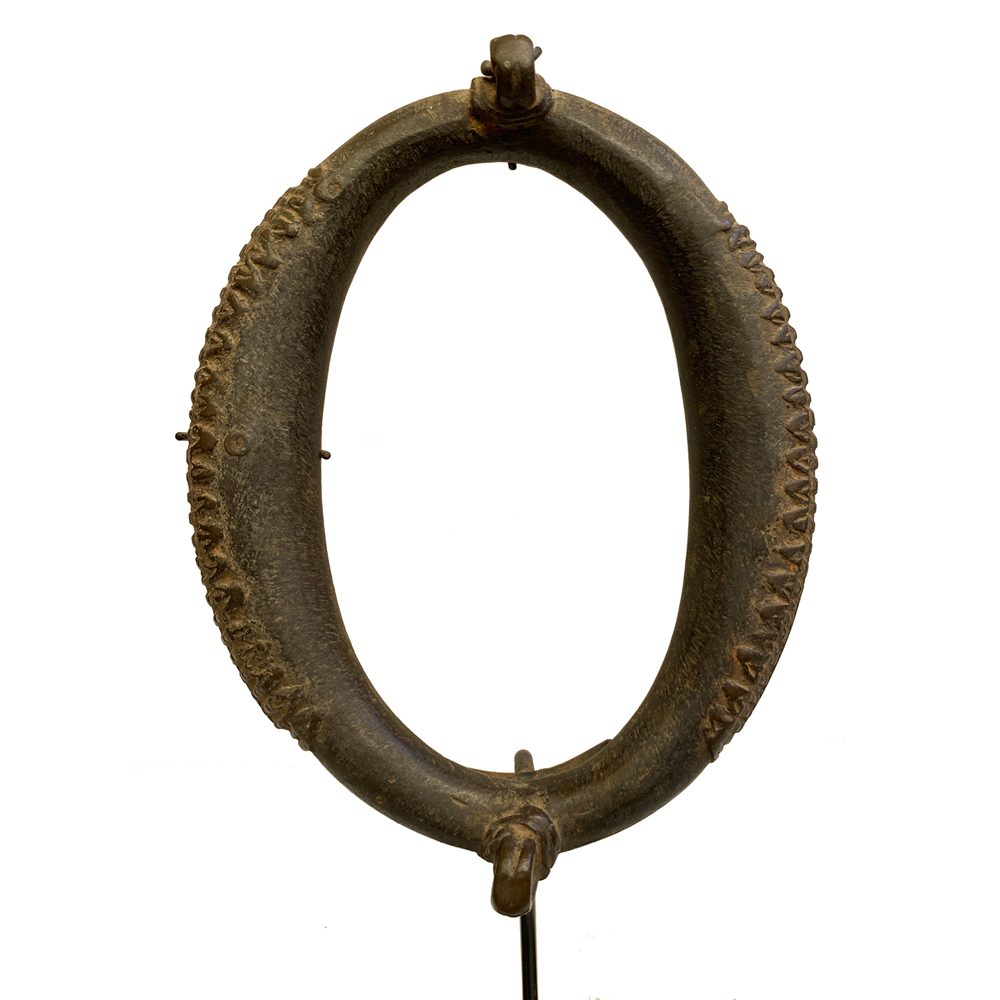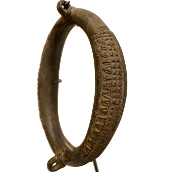 The anklet is a hollow bronze form with raised form that look like stitching, as if it were leather. Bronze casting of the finest forms has a very long tradition in India and Pakistan. The anklet was most likely used in dance or ceremony as it rattles when shaken- in a good way. This object is an art form; its beauty, that comes from simplicity and use. We custom made the stand.