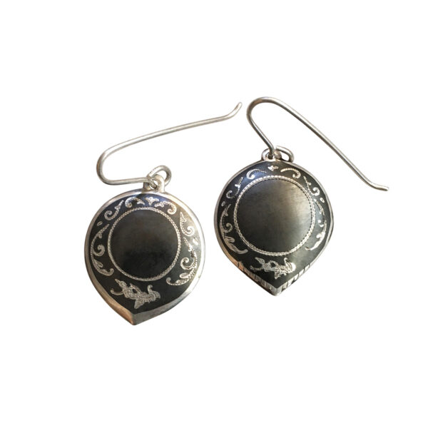 Silver charms with niello etched scrolls and exotic dancers. The charms are shallow soldered pillows and we made the sterling French hooks