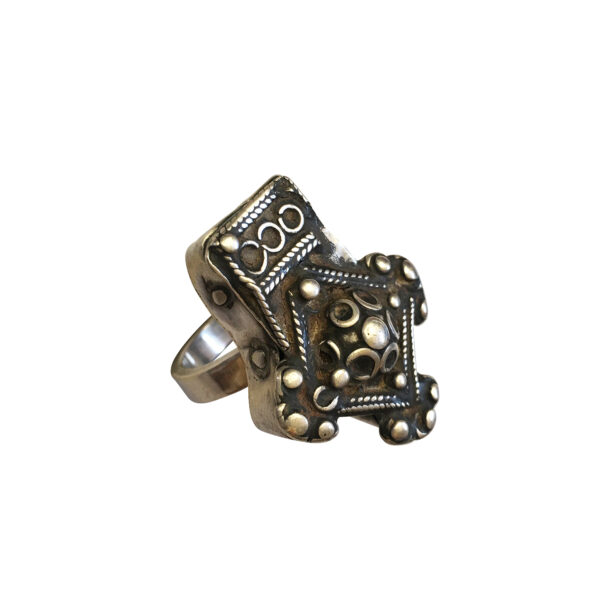These charms, usually silver, are sometimes known as Saharan crosses. They would be worn on necklaces, in the hair or incorporated in other body adornment. This piece has beautiful hand wrought work and patina. We encased it in riveted sterling.