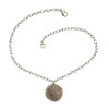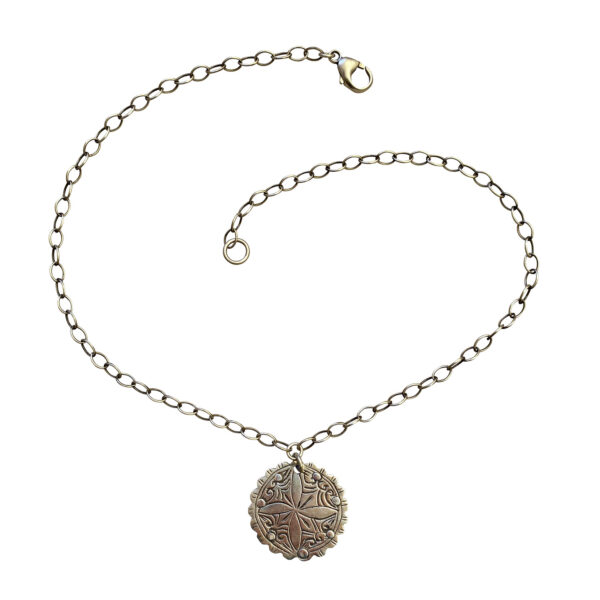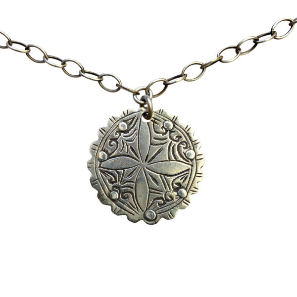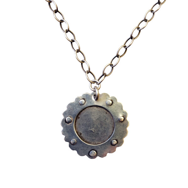 The medallion is a classic silver hand etched scalloped edge charm. These were made as headdress ornaments. We restored it with riveted sterling sheet.