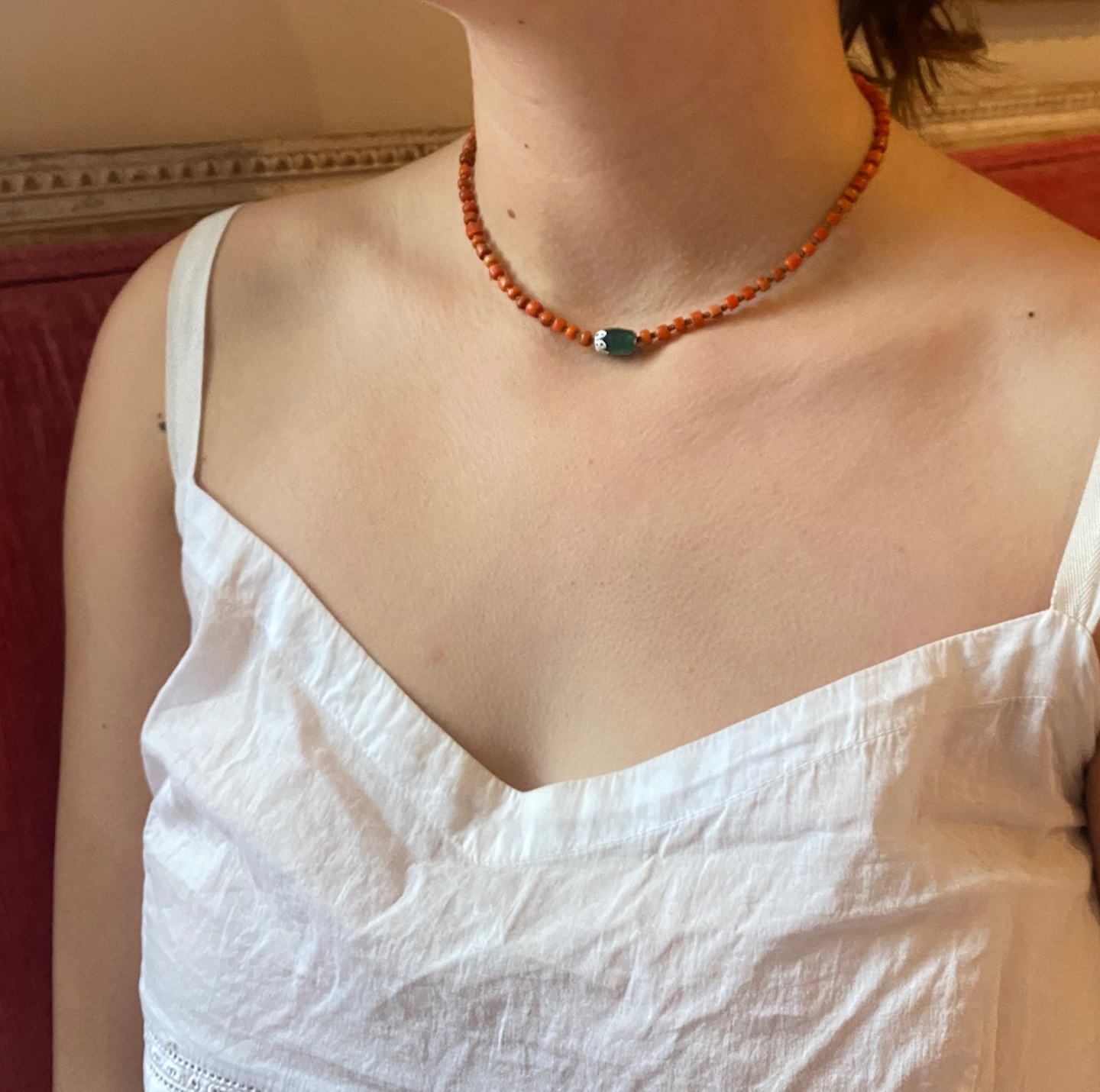 The sweetest petit coral beads, each unique, hand cut and beautifully worn from 100 years+ of wear. At the center is a wonderful rare dark green glass bead with white “lace”. How did they do it? This is our finest (thin) hand woven cord, between each tiny bead. Two days work.