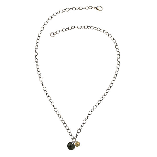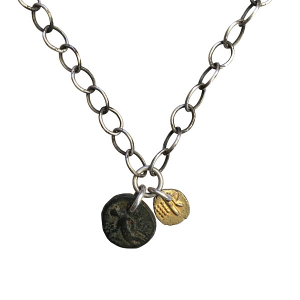 The most wonderful tiny coins of bronze and gold (gold washed) on a surprising open weave sterling chain. Jewels has a small collection of these coins.