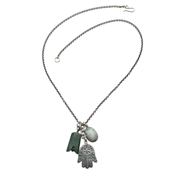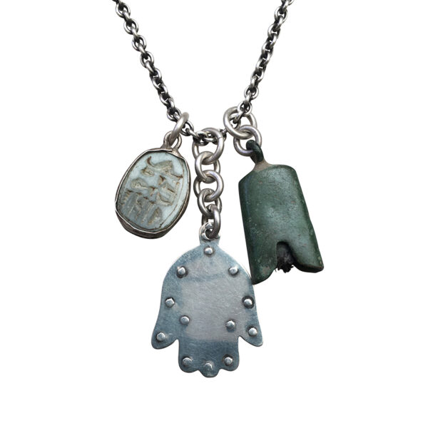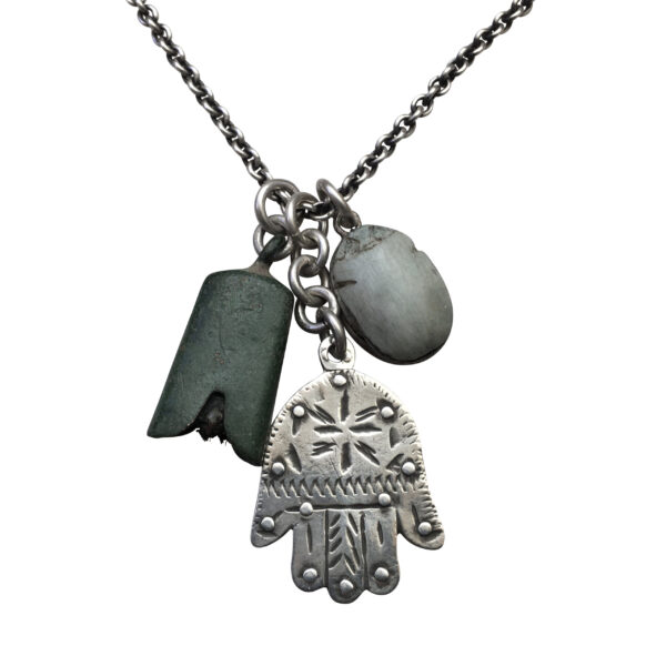 The silver hamsa is an Amazigh (Berber) amulet, beautifully hand incised. The bronze bell is ancient Roman Empire or Central Asia and the scarab is an Egyptian amulet. Musical amulets, let’s say?