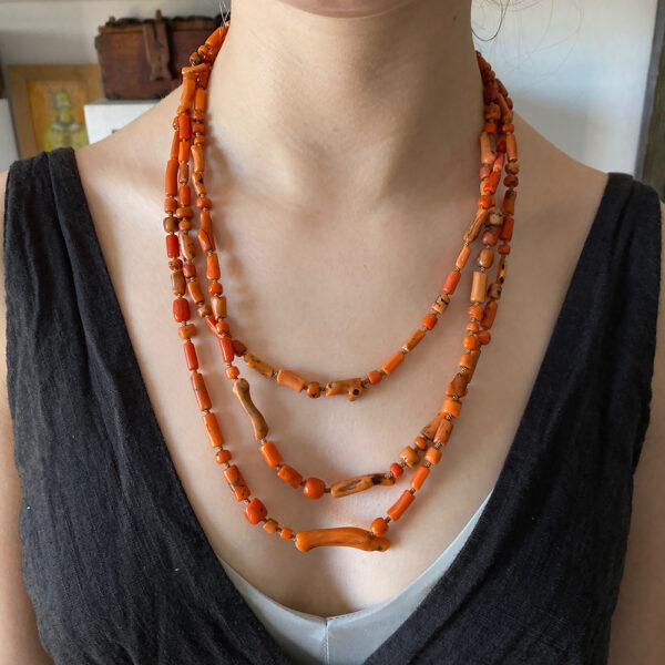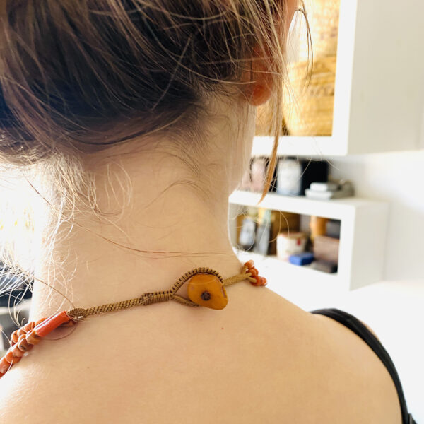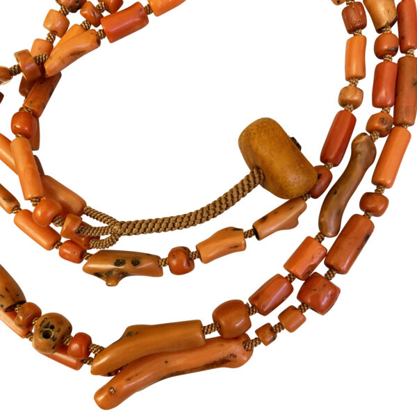 Fedua’s superb work of the hand woven cord elevates the already gorgeous branch coral beads of salmon and orange colors. (These photos do not do it justice) We finished the necklace with an amber bead button, keeping it traditional.