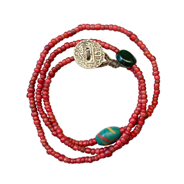 A triple wrap bracelet of rich white hearted red glass beads with an opaque blue/green, red and yellow striped bead, probably made in Italy and a French or Bohemian dark green glass bead. The white heart beads are beloved around the world and are one of those special items that holds the secret expression of beauty. It can double as a single chic necklace for a man or woman.
