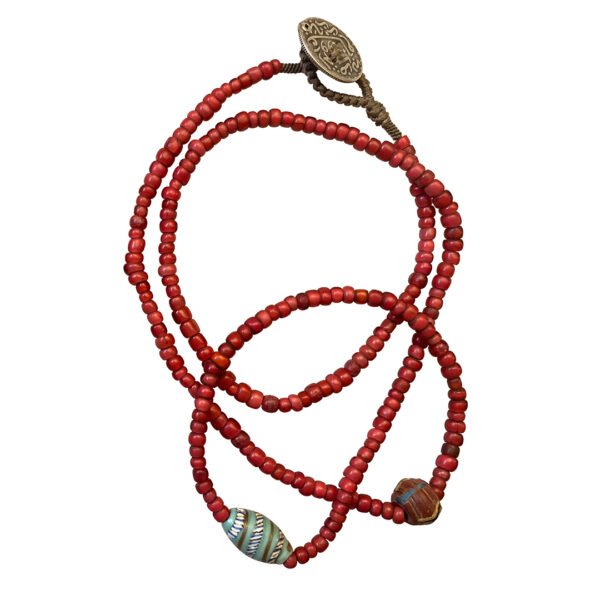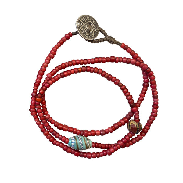A triple wrap bracelet of rich white hearted red glass beads with a couple candy-like Italian made glass beads.    The white heart beads are beloved around the world and are one of those special items that holds the secret expression of beauty. It can double as a single chic necklace for a man or woman.