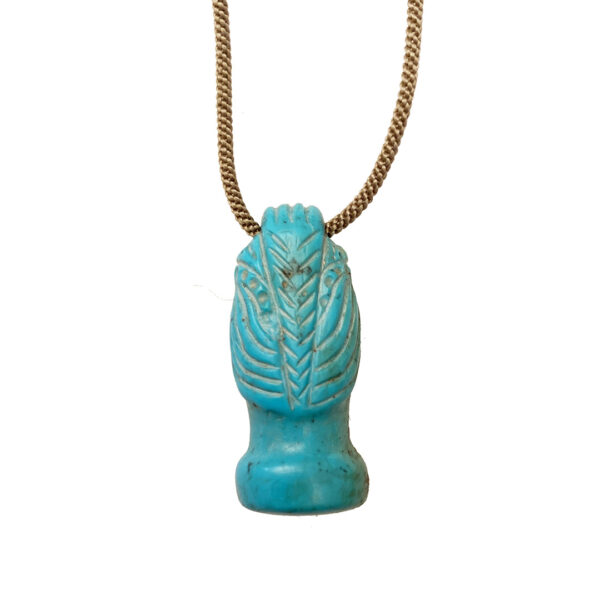 A Persian curiosity with great presence. Turquoise. The figure may be an amulet worn in battle; a portrait of a hero or protector.