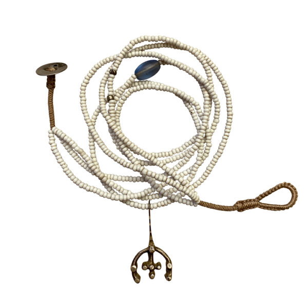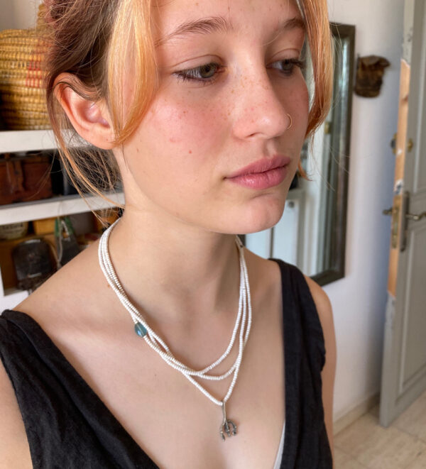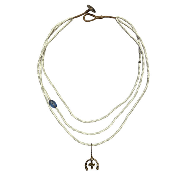 The silver charm is Moroccan, Amazigh (Berber).  It protects agains the evil eye.  The faceted blue glass is French made traded in Morocco, very highly prized.  The combination of the glass white beads, amulet, blue and silver is perfection.